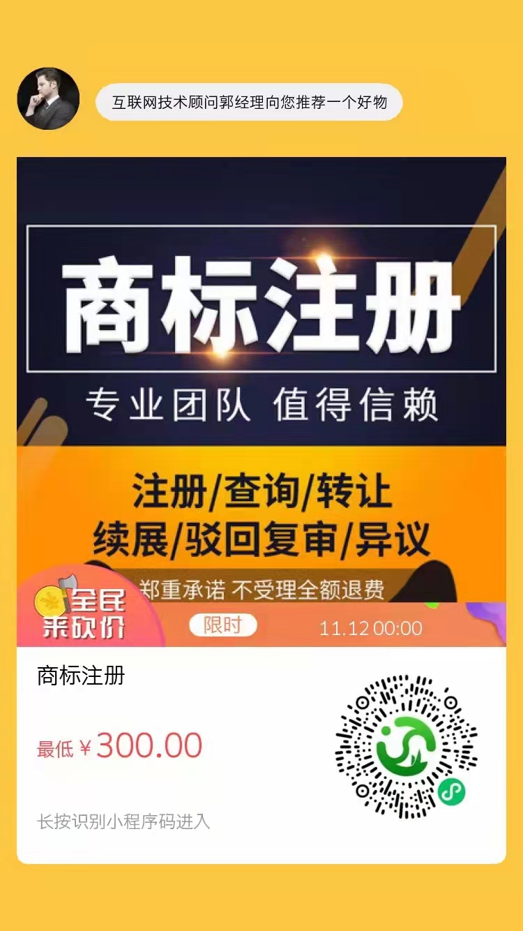 商戶要發(fā)展,品牌要打響。無(wú)論今年您的產(chǎn)品是否在雙十一電商大戰(zhàn)中擁有戰(zhàn)績(jī),現(xiàn)在樹立品牌意識(shí),重視商標(biāo)注冊(cè)等知識(shí)產(chǎn)權(quán)知識(shí)一定是發(fā)展之起點(diǎn)。抓緊參與森竹商城雙十一最后一天砍價(jià)活動(dòng),有機(jī)會(huì)獲得最低代理商標(biāo)注冊(cè)價(jià)格,愿大家都能早日實(shí)現(xiàn):我的品牌讓我做主。